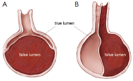 Forming a false lumen. Dissection extends along the aortic wall, usually antegrade. The false lumen can become distended and cause narrowing of the true lumen thereby impairing perfusion. The true and false lumens can communicate in the case of multiple tears. ... View Document